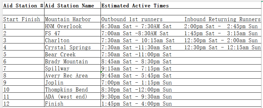 Aid stations will have the standard ultra food (bananas, pretzels, potatoes, chips, water, Tailwind Nutrition, etc.), with some additional unique treats. If you have special dietary restrictions, please plan accordingly.